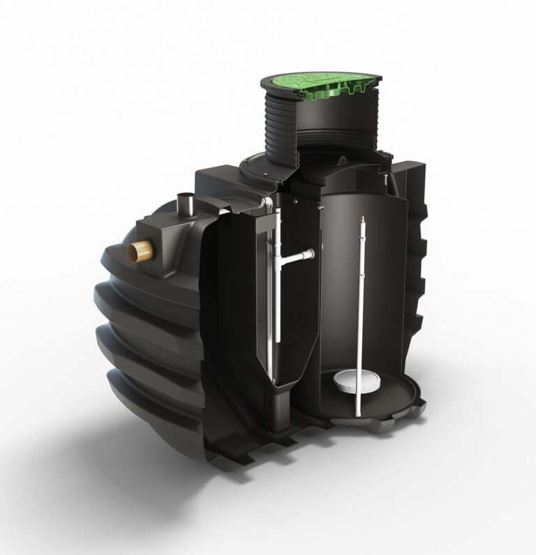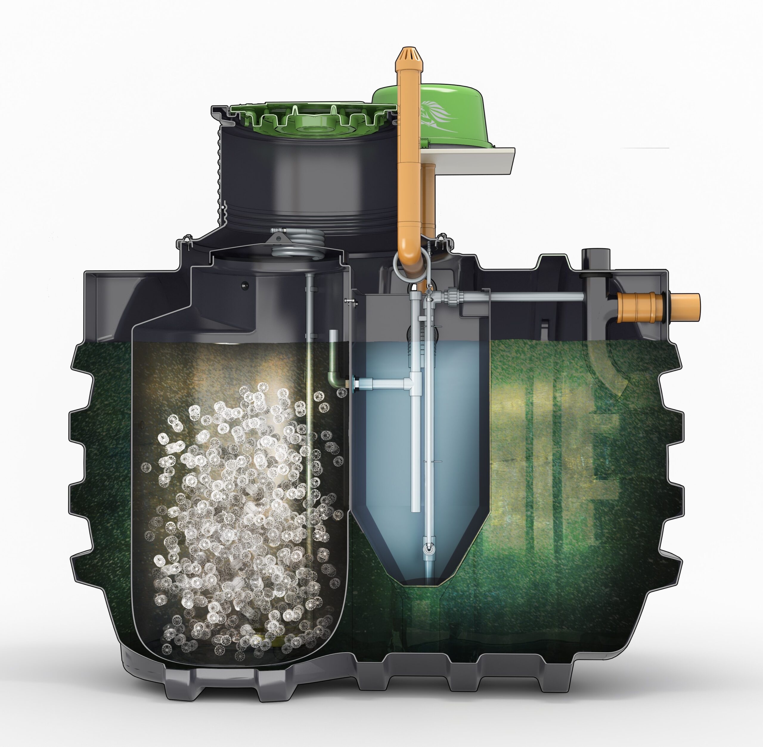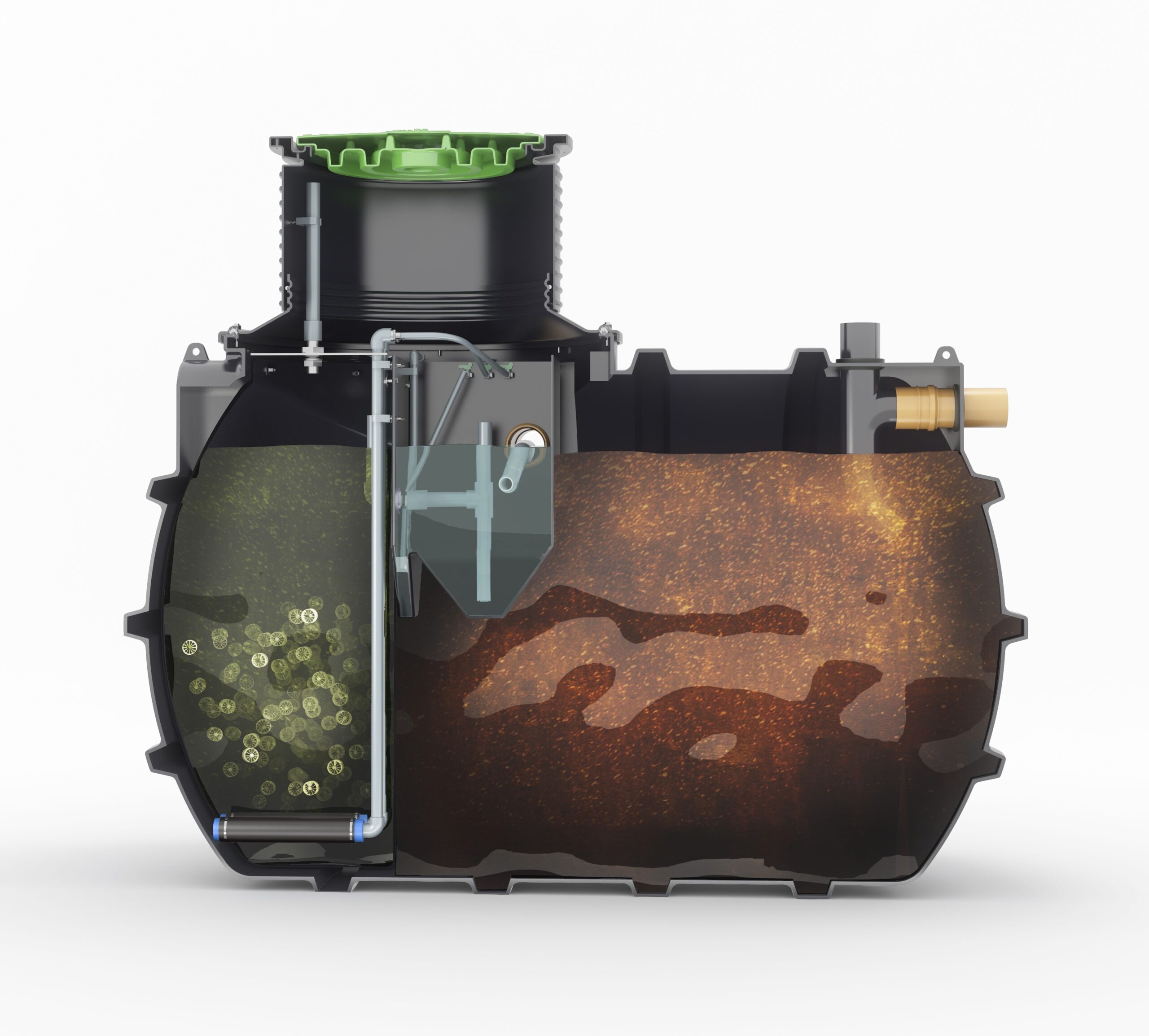 U tom slučaju pročišćena tekućina gravitacijski otječe u dodatnu komoru koja sadrži visokoučinkovitu potopnu pumpu s plovkom. Nakon što razina vode dosegne određenu visinu, pumpa automatski prepumpava pročišćenu vodu.